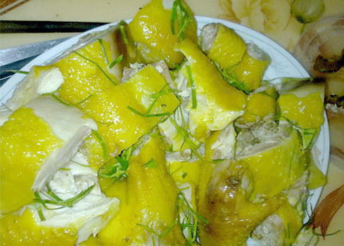 - Đun sôi nước đặt gà vào trong nồi, đun cho gà bớt mùi hôi. Lại đặt gà vào nồi nước dùng, thêm nước ngập qua mình gà, thêm vài lát gừng và hành hoa cuốn để làm giảm mùi tanh của gà.